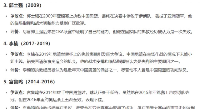 以上几位教练在执教中国男篮期间都曾引发较大争议,但他们的失败也反映了中国男篮整体实力的下滑和青训体系的不足。