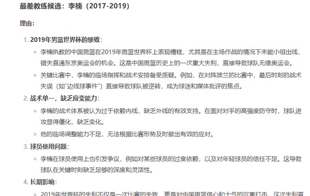 今日,小编让Deepseek评选了“中国男篮史上最差教练”,它一共罗列出来了5人,郭士强也在其中,同时也说明了选择理由,究竟谁会被评为“最差”的那一个呢?
