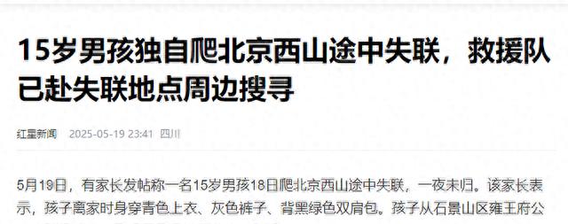 根据红星新闻、新京报等多家媒体报道称,就在5月19日当天,有一位家长发布帖子称自己15岁的孩子于18日爬北京西山途中失联,一夜未归。