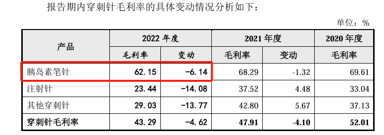 此外,在产品定价方面,2022年公司胰岛素笔针销售单价为0.22元/支,而同业企业贝普医疗同类产品单价仅为0.15元/支,价差超30%,但贝普医疗该产品毛利率为62.15%,远高于普昂医疗的48.28%。在同类产品竞争格局下,如此显著的价格与毛利率差异缺乏合理说明,引发市场对公司产品定价策略与盈利能力真实性的质疑。