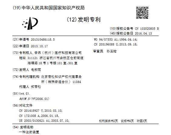 另一方面,尽管普昂医疗在业务发展与技术研发上取得了一定成果,但其核心技术来源的合理性备受关注。招股书显示,微痛注射技术对应的核心发明专利“一种注射装置”由公司实控人毛柳莺于2013年10月申请。