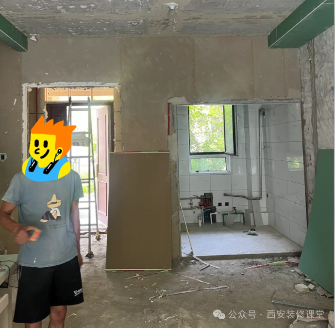 卧室门洞无法砸高,采用假门眉的形式让其保证与厨房门洞高低一致,此时厨房门,卧室门以及大梁刚好协调一致。