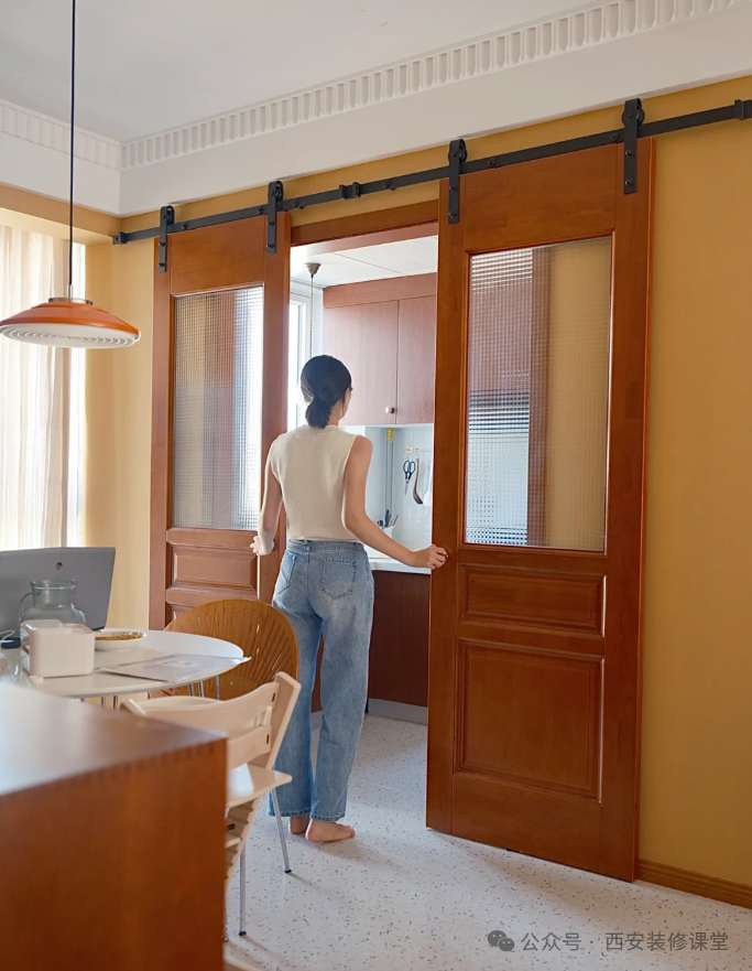 解决办法:把此时最好的办法就是宽大的厨房门洞做一组超薄柜,缩小厨房门洞,然后采用外挂的谷仓门作为厨房门,因为谷仓门的高度可以自己控制,做的时候高于原有门洞即可,这样视觉上厨房门变窄成就一组柜子,而且视觉上提高了厨房门洞的高度。