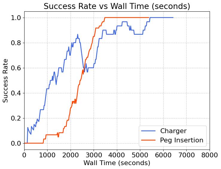 两个任务的成功率曲线如图 6 所示。可以发现,两个任务均可以在 1.5h 以内收敛。收敛后,Peg Insertion 任务可以连续 100+ 次成功,Charger 任务可以连续 50+ 次成功。
