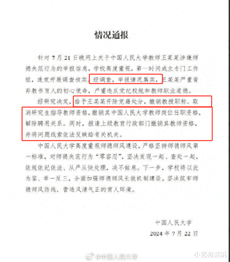 当天晚上,高效率的中国人民大学发出情况通报:经调查,举报情况属实!并且,对其作出了处罚!