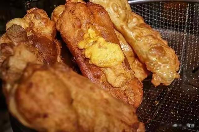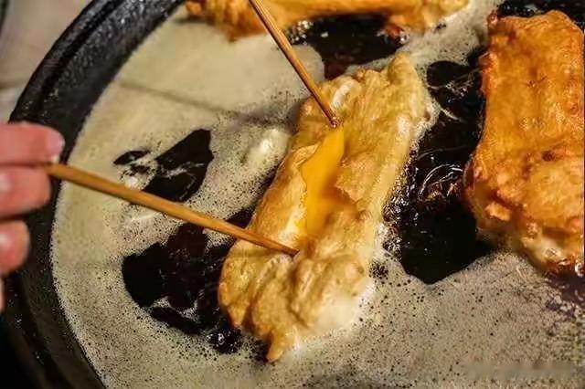 具体制作方法:趁着快要炸熟的时候,在油大头的中间划个口子,快准狠的把鸡蛋打进去,做成“油大头夹蛋”。据说刚出炉的这个新式油大头特别好吃,酥酥脆脆的模样,咬下一口,外酥里嫩,内瓤加鸡蛋馅,很有嚼劲,越吃越香。