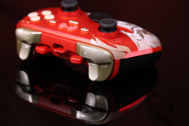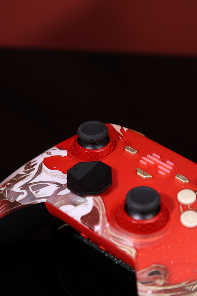 作为核心的视觉呈现,手柄本身的设计充分呼应了马年主题。整体以喜庆的红色为主基调,面板上融入了细腻的金粉装饰元素,在光线下呈现出华丽而内敛的质感,细节处尽显巧思:按键区域饰有传统的祥云纹样,象征着吉祥与高升。