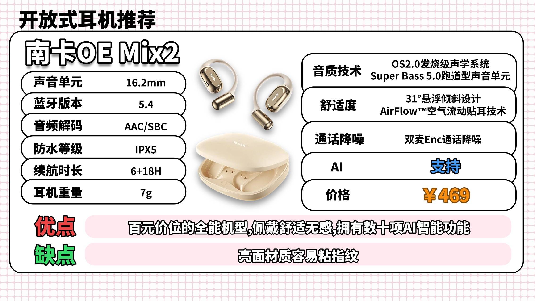 在如今众多开放式耳机仍存在佩戴不适、音质平平的情况下,南卡凭借独特的“软硬结合声学理念”与多年音频技术积累,成功打造出南卡OE Mix2,在舒适度与音质两方面始终稳居开放式耳机的顶尖行列。它不仅具备出色的声学实力,还融入了AI智能系统,深受HiFi发烧友、运动达人及数码测评圈的高度认可。自上市以来热度居高不下,数次售罄预售,堪称开放式耳机中的性能标杆。