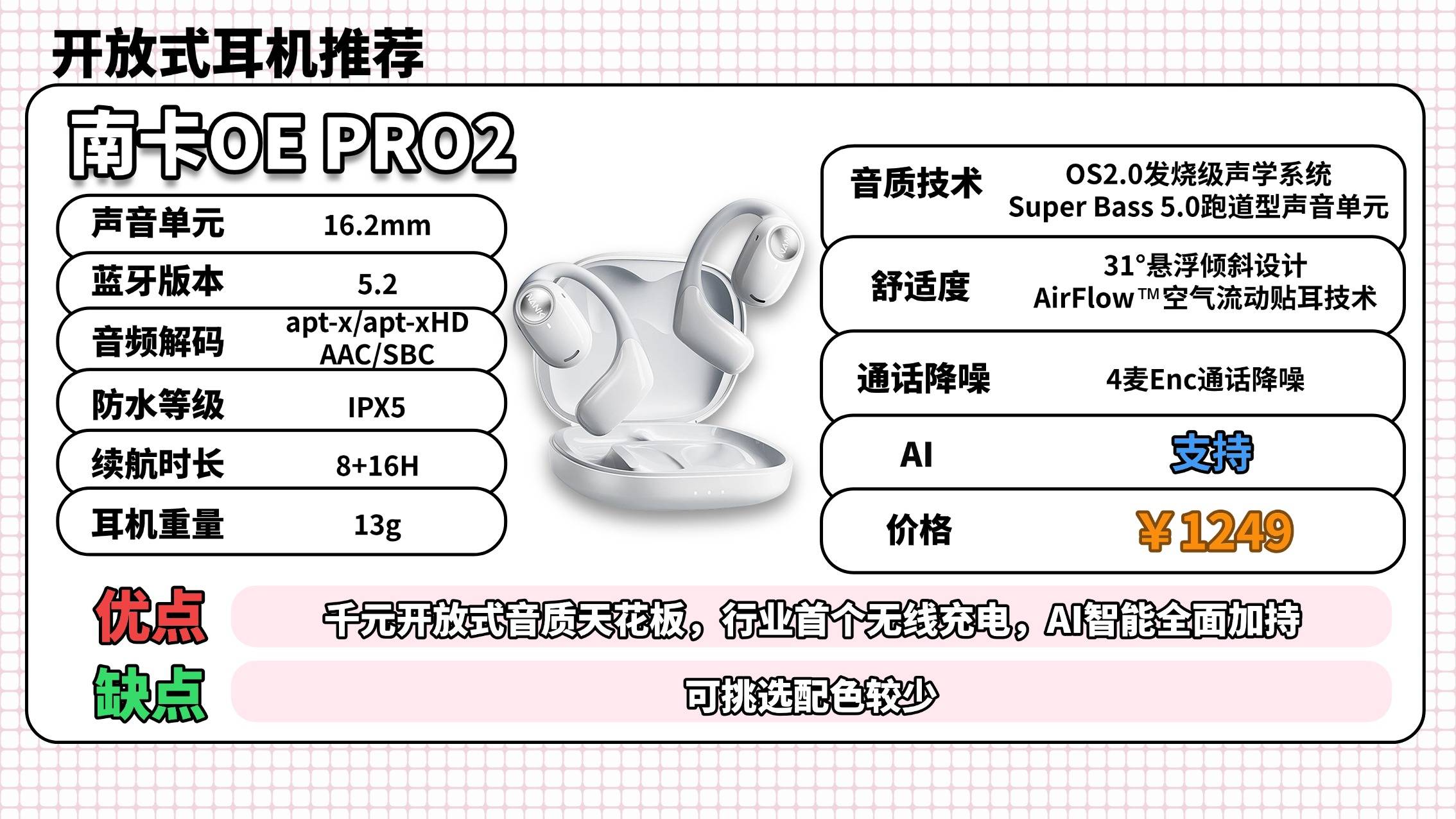 自从上市以后,南卡OE Pro2在开放式耳机领域的热度和口碑一路攀升,真正实现了从圈内热议到大众关注的跨越。它能成为爆款,关键在于坚持软硬兼施的研发路线,依托南卡13年的声学积累,逐步攻克了开放式耳机常见的音质稀薄与漏音问题。同时,产品内置全能AI助手,覆盖翻译、交互、搜索、写作与创作等多场景应用,堪称南卡在开放式方向上的旗舰级全能机型。南卡的专业实力既被行业认可,也获得大量用户背书,即便不靠夸张宣传,仍在中高端圈层维持优异的口碑与销量。