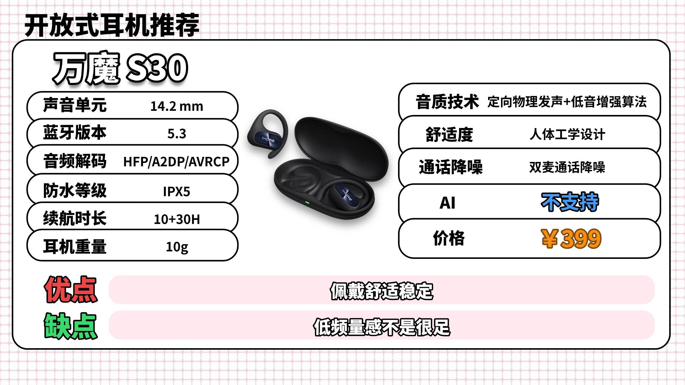 该耳机搭载定向传声单元,能在贴近耳道的位置将声音精准送入耳内,即使在嘈杂环境中也可保持清晰听感,并有效减少漏音。音质表现方面,万魔S30采用14.2mm类钻石振膜动圈单元,结合低频增强算法,呈现出更为深沉扎实的低频效果,使整体声音层次更丰富、听感更饱满。