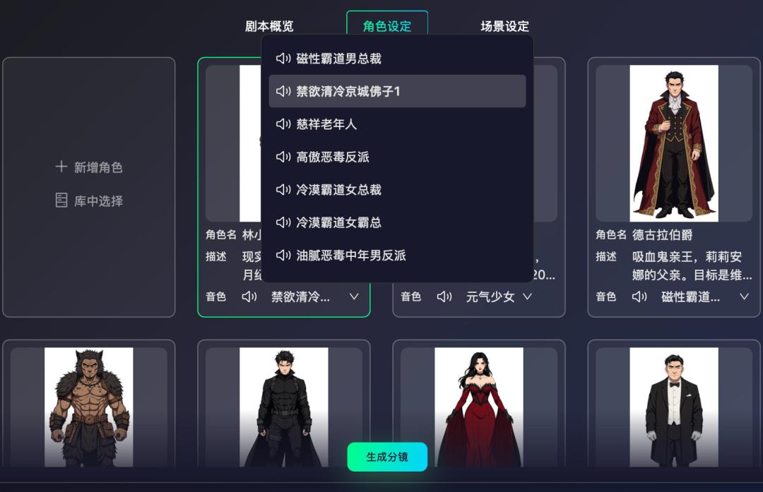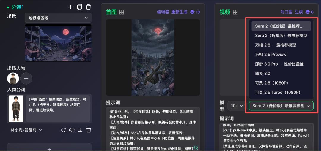下一步选定场景、角色,根据已生成的提示词一个一个生图(10积分/张)、生视频(5s/10s/15s)。批量操作的前提是积分管够。