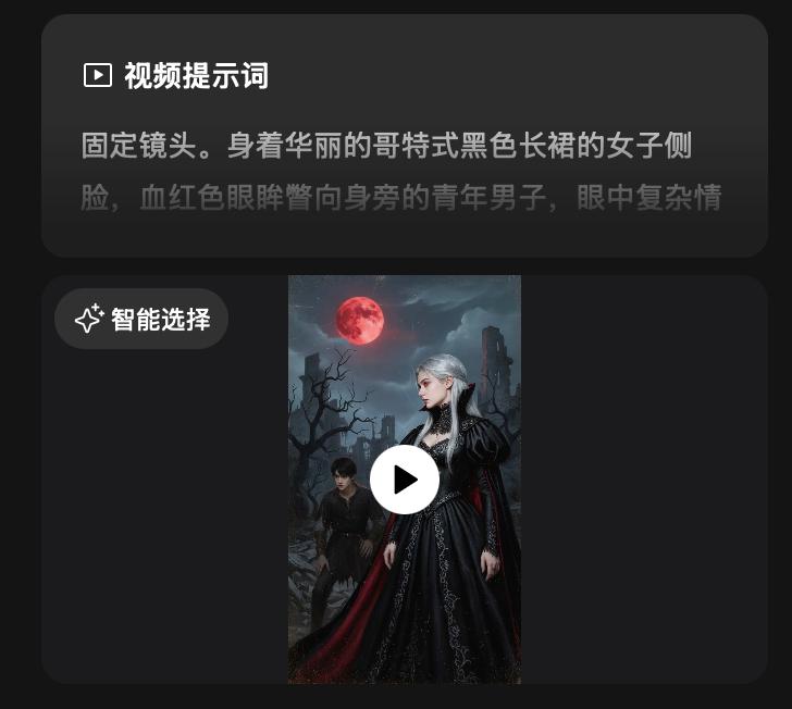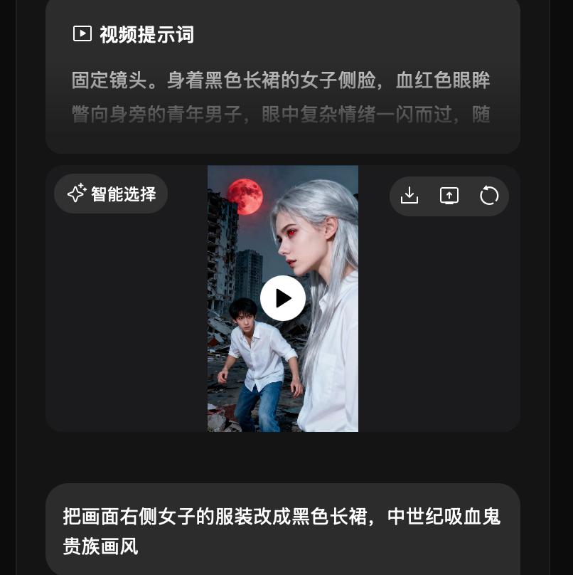 吸血鬼女主提示词全程要求是“穿着黑色长裙的女子”,但就会在某一帧突然变成白色衬衫;