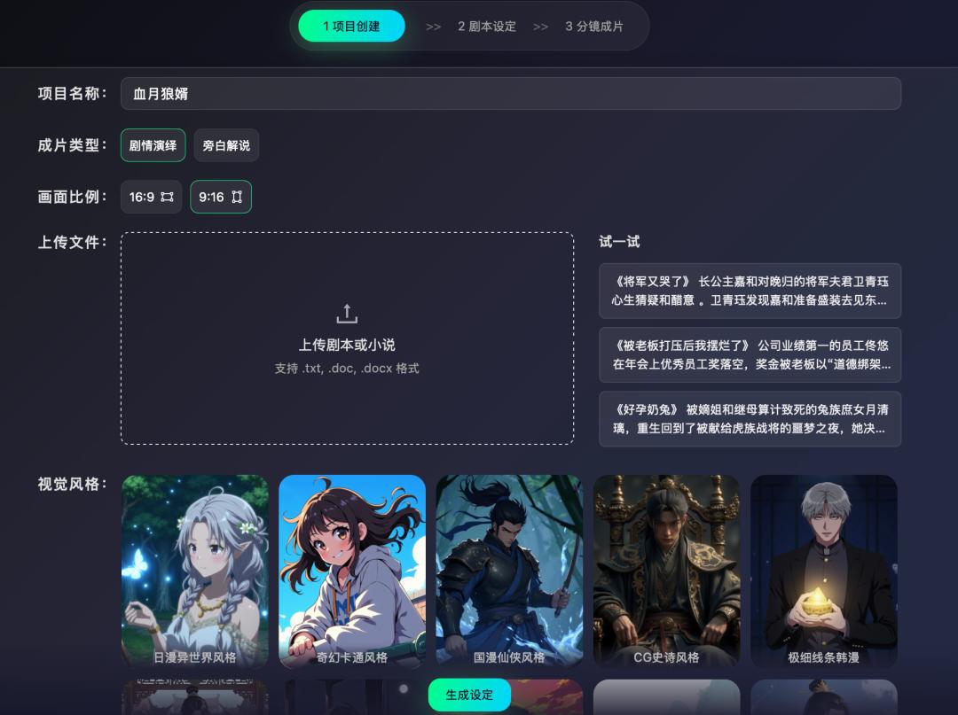 灵境AI目前还没有这么“傻瓜操作”,它第一步就要求“上传剧本或小说”,我用千问继续把上文梗概扩展成“故事大纲+人物小传+前三集剧本”喂给它。