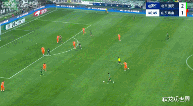第45+4分钟,古加禁区后点抽射破门,国安2-1反超9人山东!