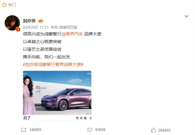 刘亦菲在社交平台发文宣布自己成为智界汽车的品牌大使。
