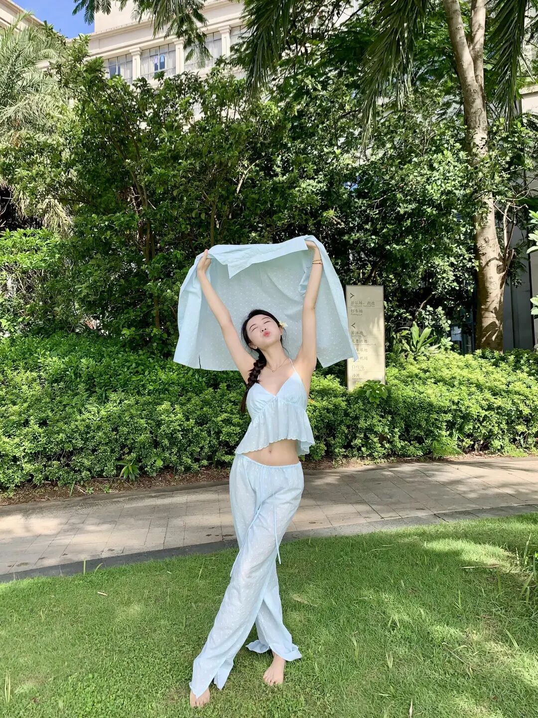 户外大自然拍照很适合手撑衣服举起来的动作,衣服被撑起时整个人会显得灵动,wink眼笑的表情会让画面变得俏皮一点,站在草地或树下的时候效果更明显,身体伸展的时候整个人会有一种不做作的生命力,看起来轻松也很上镜。