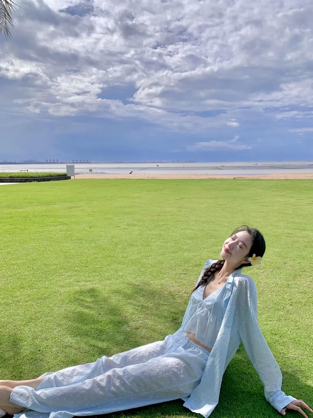 盘腿坐草地很贴近大自然,户外拍照用这个姿势会显得自在,单手撩发的动作很生活化,看镜笑的时候整个状态会很松弛,整张照片会显得特别轻松,不会造作,也不会拘谨,像真的在休息一样。