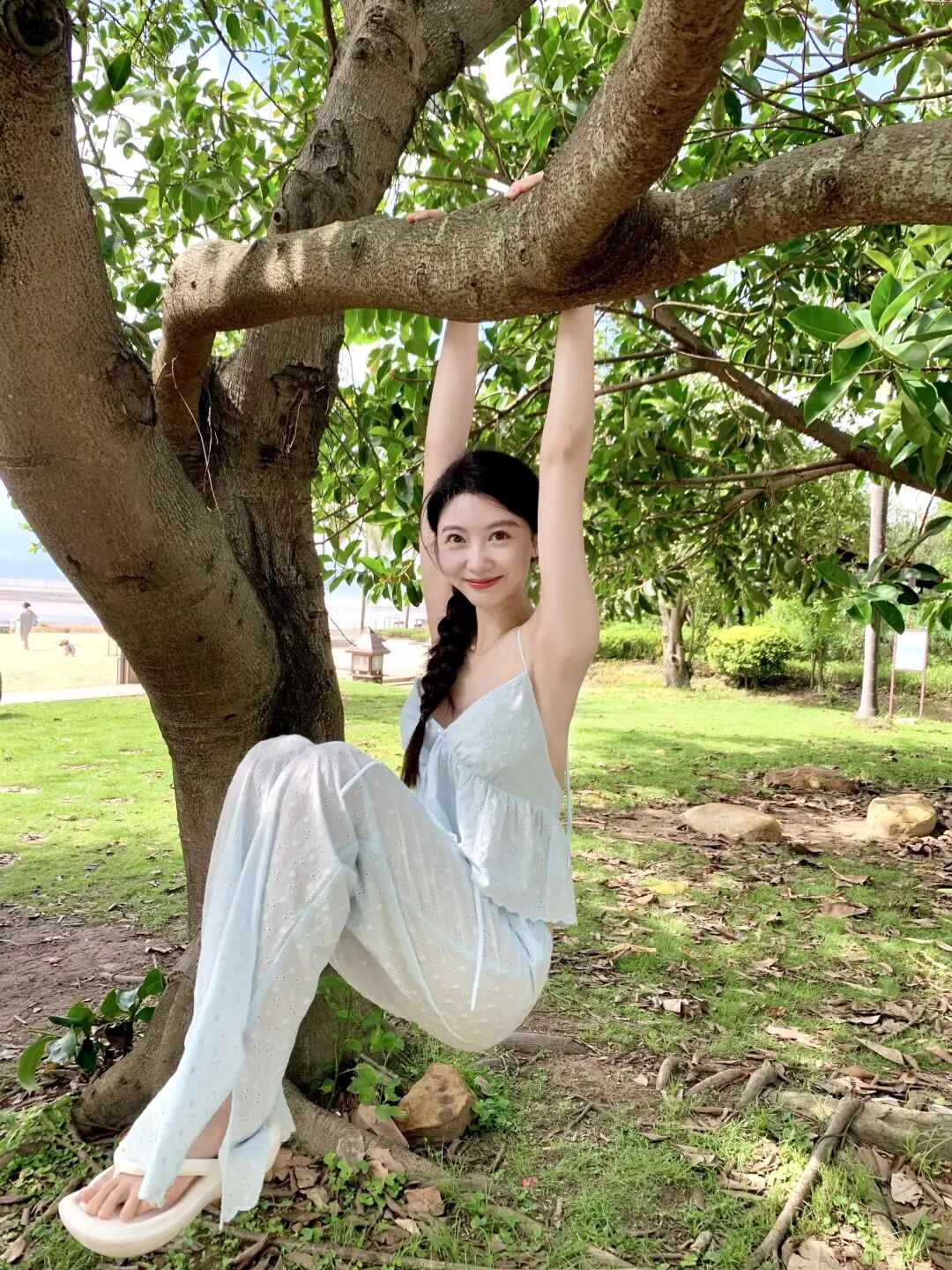 挂树干上的动作很生活化,户外大自然拍照这样做会更轻松,曲脚的动作让画面多一点俏皮感,回头微笑的时候脸会显得更柔和,整个人像在玩耍一样,这种姿势特别适合户外,轻轻靠着树就能拍出很治愈的感觉。