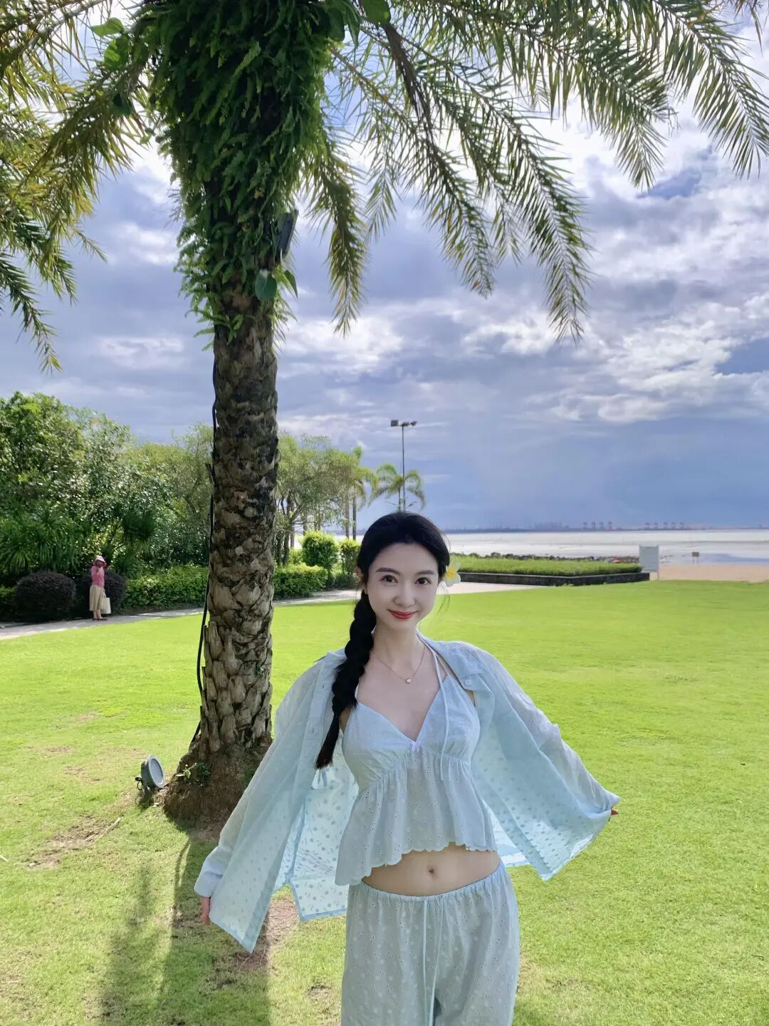 站在草地上拍照时,双手微张的动作最万能,户外大自然拍照用这种姿势会很自然,手不紧绷,身体轻轻打开,微微笑就足够好看,这个动作不用多想,穿什么都能拍得干净漂亮,也很适合拍全身照。