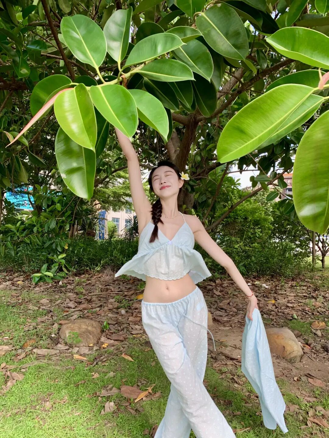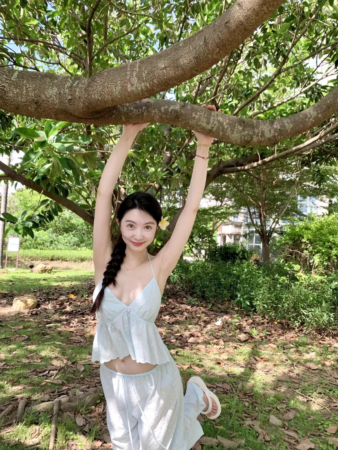 交叉腿站在树下能让身体更挺拔一点,单手举高闭眼笑的动作很松弛,户外大自然拍照做这一组动作会显得特别舒服,身体的延伸感会让整个人更漂亮,闭眼笑也不会尴尬,很适合不太会摆姿势的人。