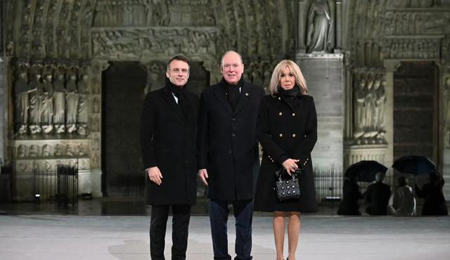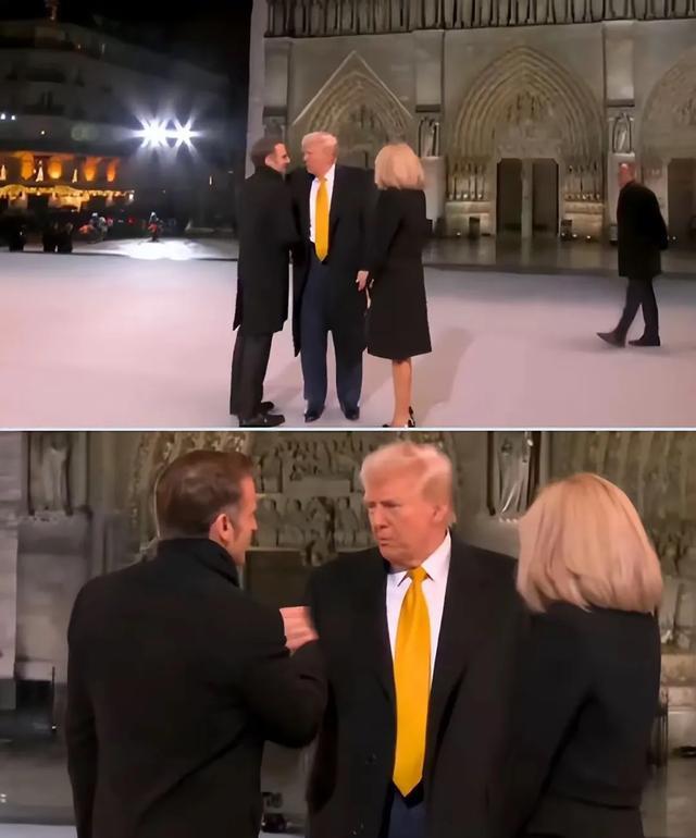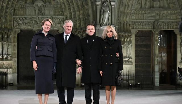 马克龙和夫人布里吉特一早就在巴黎圣母院门外迎接远道而来的贵宾。
