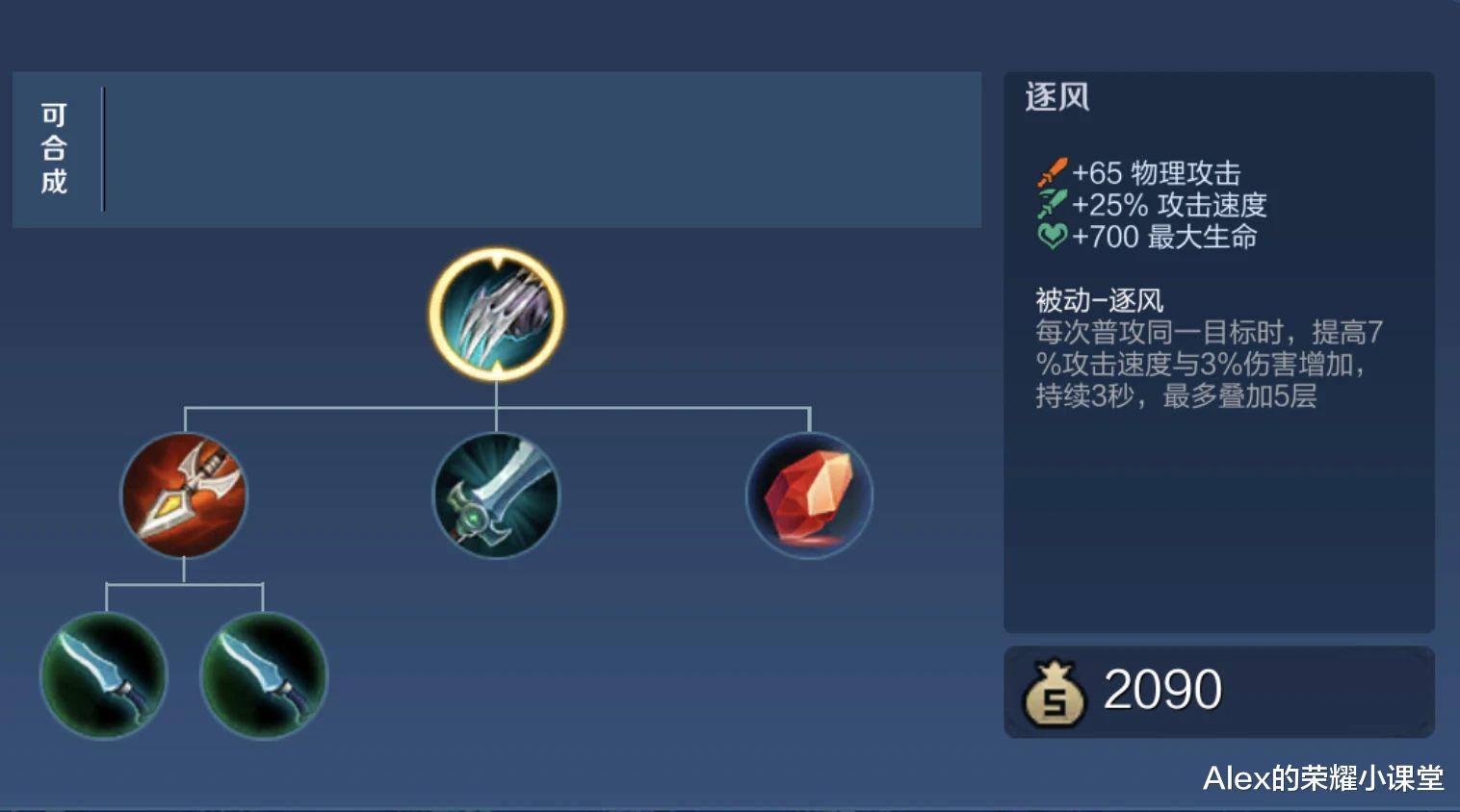 新版逐风面板属性:65物理攻击、25%攻击速度、500点生命值,售价2090金币。