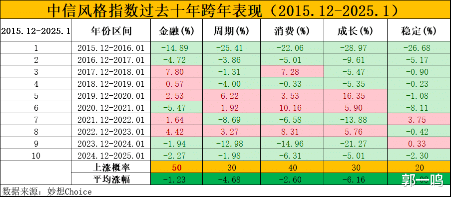 这些数据指向一个清晰的结论:A股跨元旦周期并不存在持续的“跨年行情”。近10年的大数据显示,该周期内指数、风格、行业的平均表现以负收益为主,上涨概率普遍低于50%,即便局部出现上涨,也不具备普适性和盈利弹性。