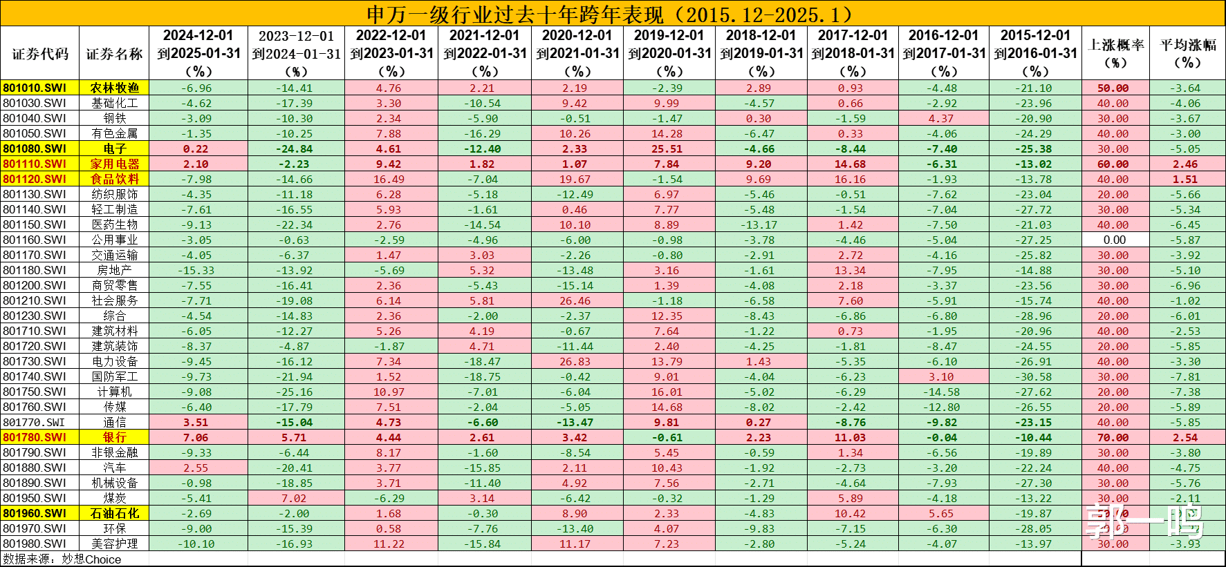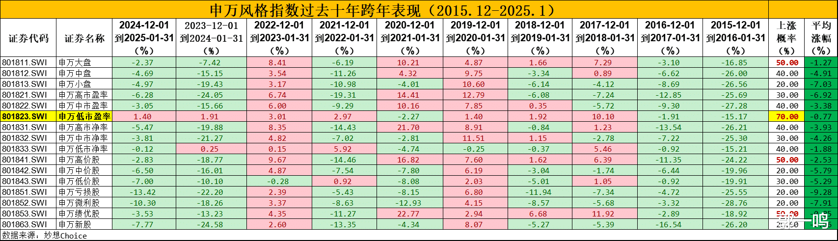 再从风格与行业维度验证:申万风格指数中,多数风格的平均涨幅为负,申万小盘平均跌幅达-7.03%,上涨概率仅20%;中信风格里的成长、周期指数平均跌幅超-4%,上涨概率普遍低于50%。而申万一级行业中,仅银行、家用电器等少数行业上涨概率超过60%,但银行的平均涨幅仅2.54%,多数行业(如国防军工、传媒)平均跌幅超-5%,行业层面并未出现趋势性的跨年机会。