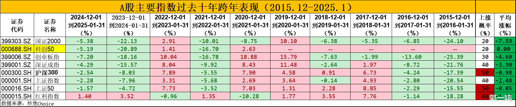 先看A股主要指数的跨元旦表现:10年间国证2000、创业板指、深证成指等核心指数的平均涨幅全部为负,其中创业板指平均跌幅达-4.60%,国证2000为-7.59%;即便是表现相对“突出”的红利指数,虽然上涨概率达到60%,但平均涨幅仅为-1.13%。这意味着即便部分年份出现上涨,幅度也难以覆盖下跌周期的亏损,整体呈现“涨少跌多、涨弱跌强”的特征。