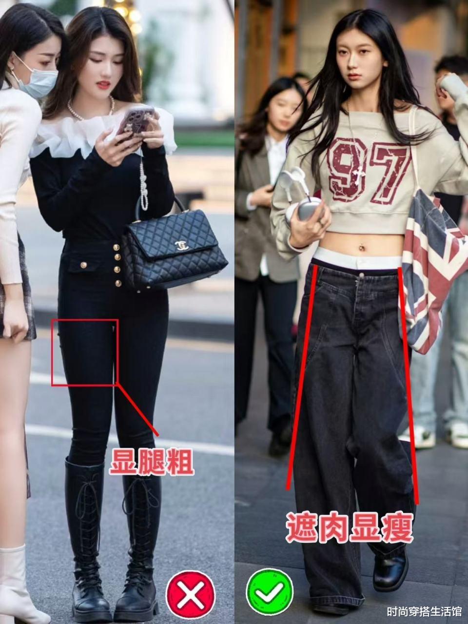 像紧身裤的版型会紧紧的贴合我们的腿型,所以穿上的话会暴露我们的腿型,尤其是腿型不直或者有赘肉的小腿更会拉低气质。反之我们选择宽腿裤能够有效的隐藏小腿的线条,从而使我们的腿部看起来更加的修长和显高。
