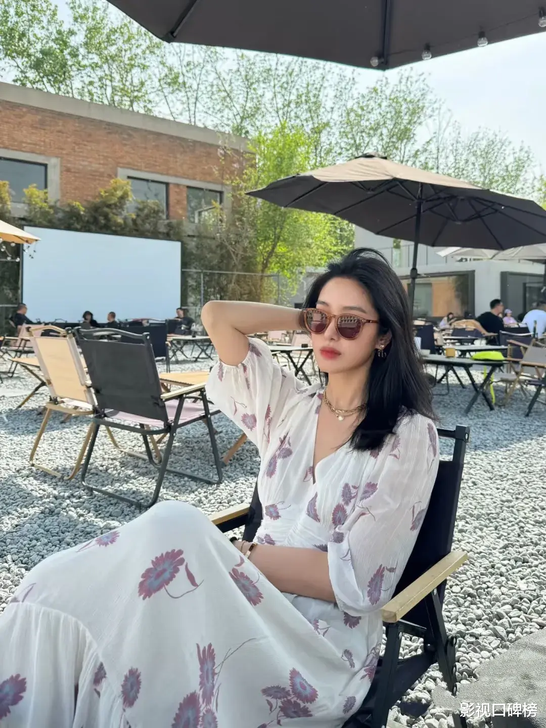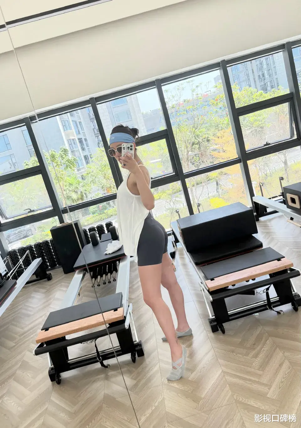 杨采钰的健身照片是穿着宽松的白色上衣下搭紧身短裤,戴着墨镜,她将头发盘起。