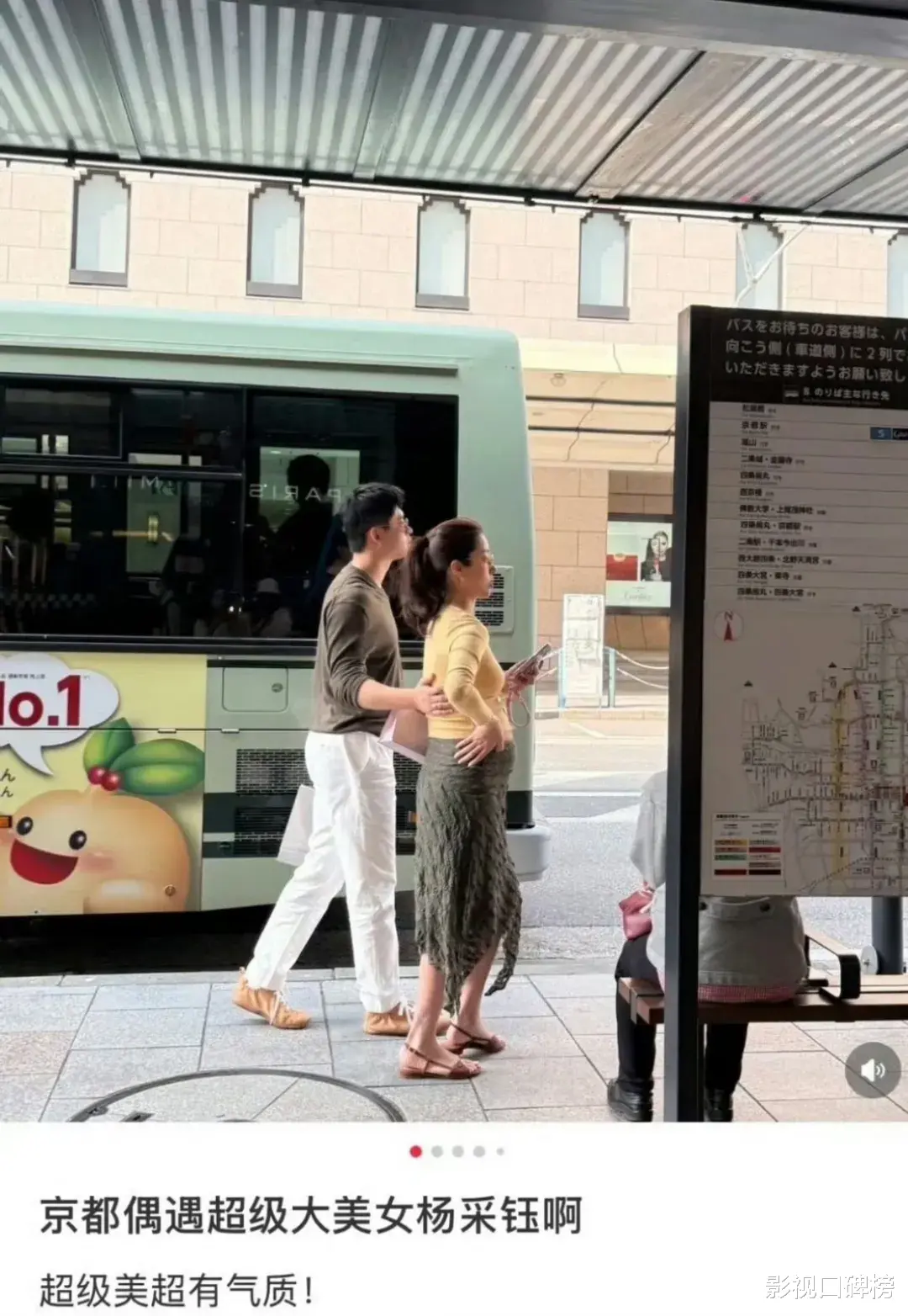 4月16日有网友晒出在日本街头偶遇杨采钰挺着孕肚,当天她穿着黄色长袖上衣下搭墨绿色长裙,脚踩着平底凉鞋。杨采钰走路时小心翼翼,身边还有一位男士很贴心跟着她,照顾她。
