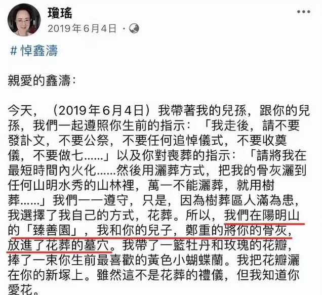 据悉,琼瑶阿姨的骨灰将于两天后的下周一,在风景秀丽的阳明山进行花葬。