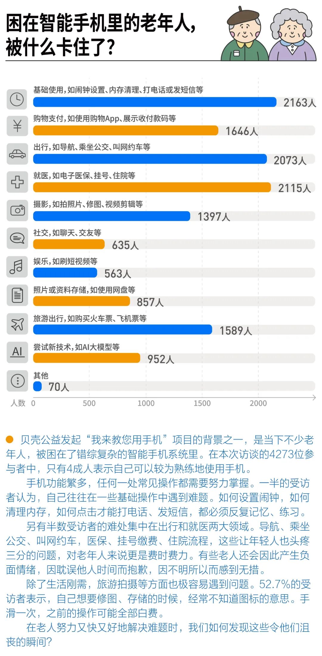 他不是个例。数据显示,2163位老年人表示连最基本的“打电话、清理内存、发短信”都操作困难;2115人卡在挂号、就医上;2073人用不好导航、网约车。