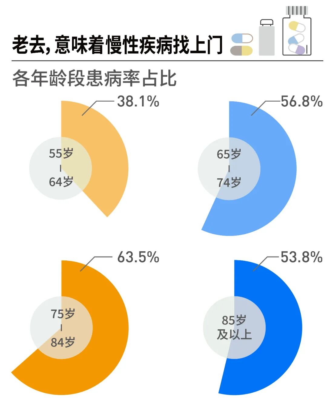 与此同时,独居老人的身体也在与时间赛跑。调研显示,65 岁以上人群中,超半数患有慢性病,而 75 岁以上人群的患病率高达 63.5%。