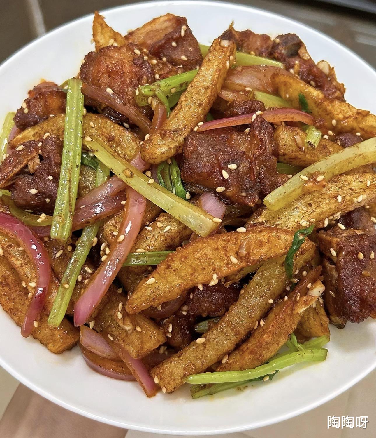排骨焦香酥脆,土豆外酥里糯,撒上多多的孜然粉,再配上一碗喷香软糯的米饭,根本就吃不够!