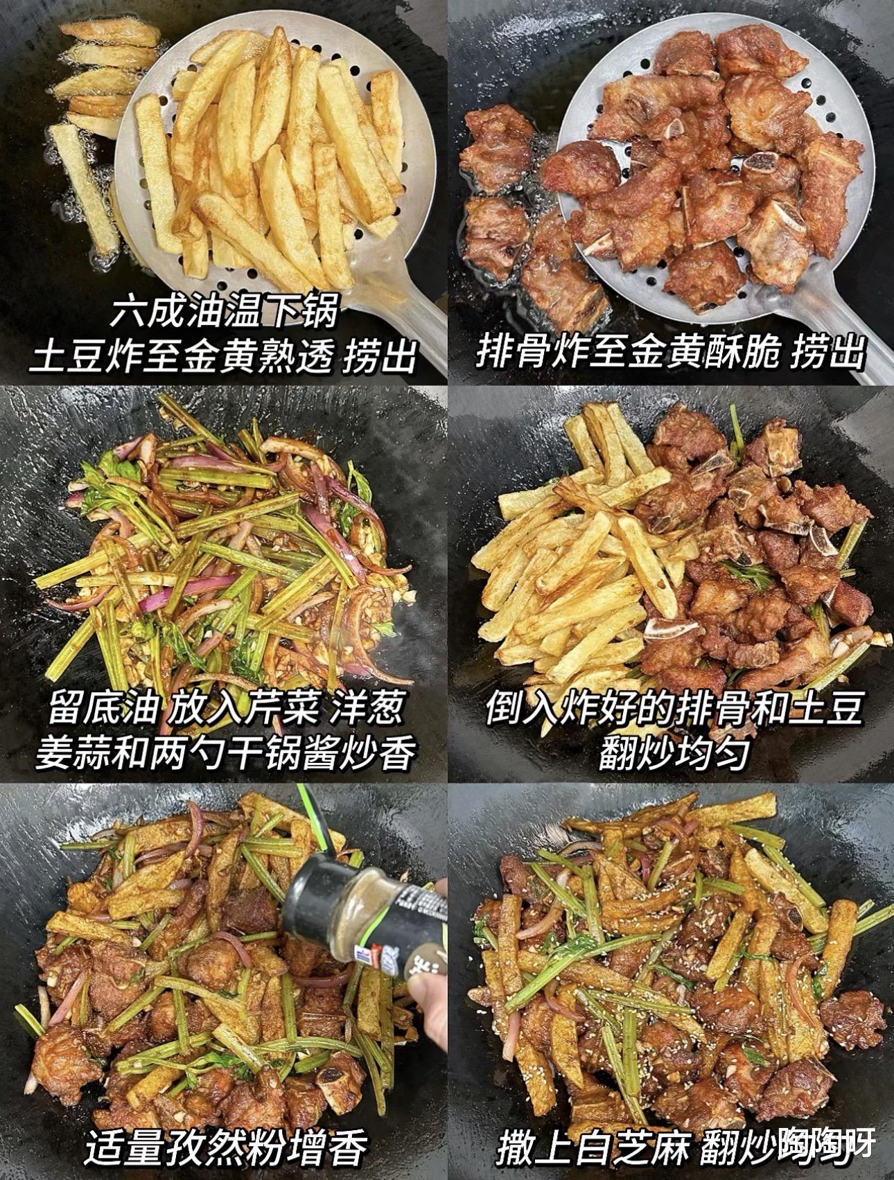 2. 放入炸好的排骨和土豆条,翻炒均匀。