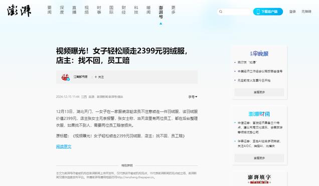 澎湃新闻 视频曝光!女子轻松顺走2399元羽绒服,店主:找不回,员工赔2024-12-15