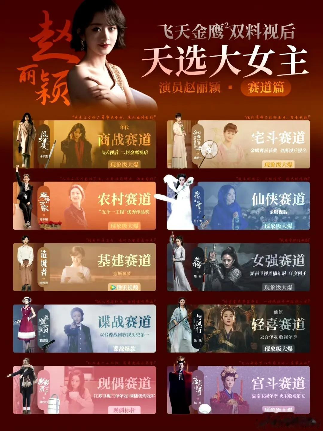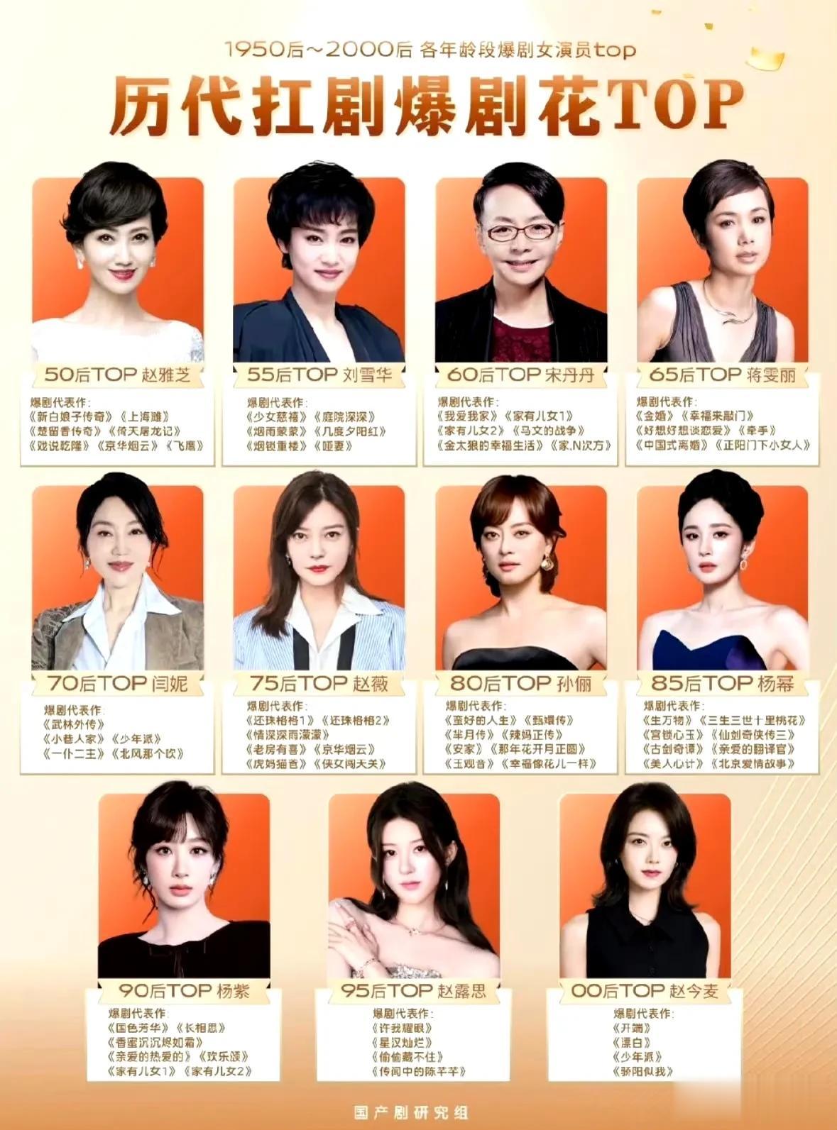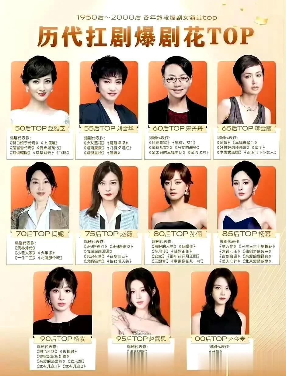 而这,来自网友对内娱1950后~2000后各年龄段爆剧女演员代表的总结。