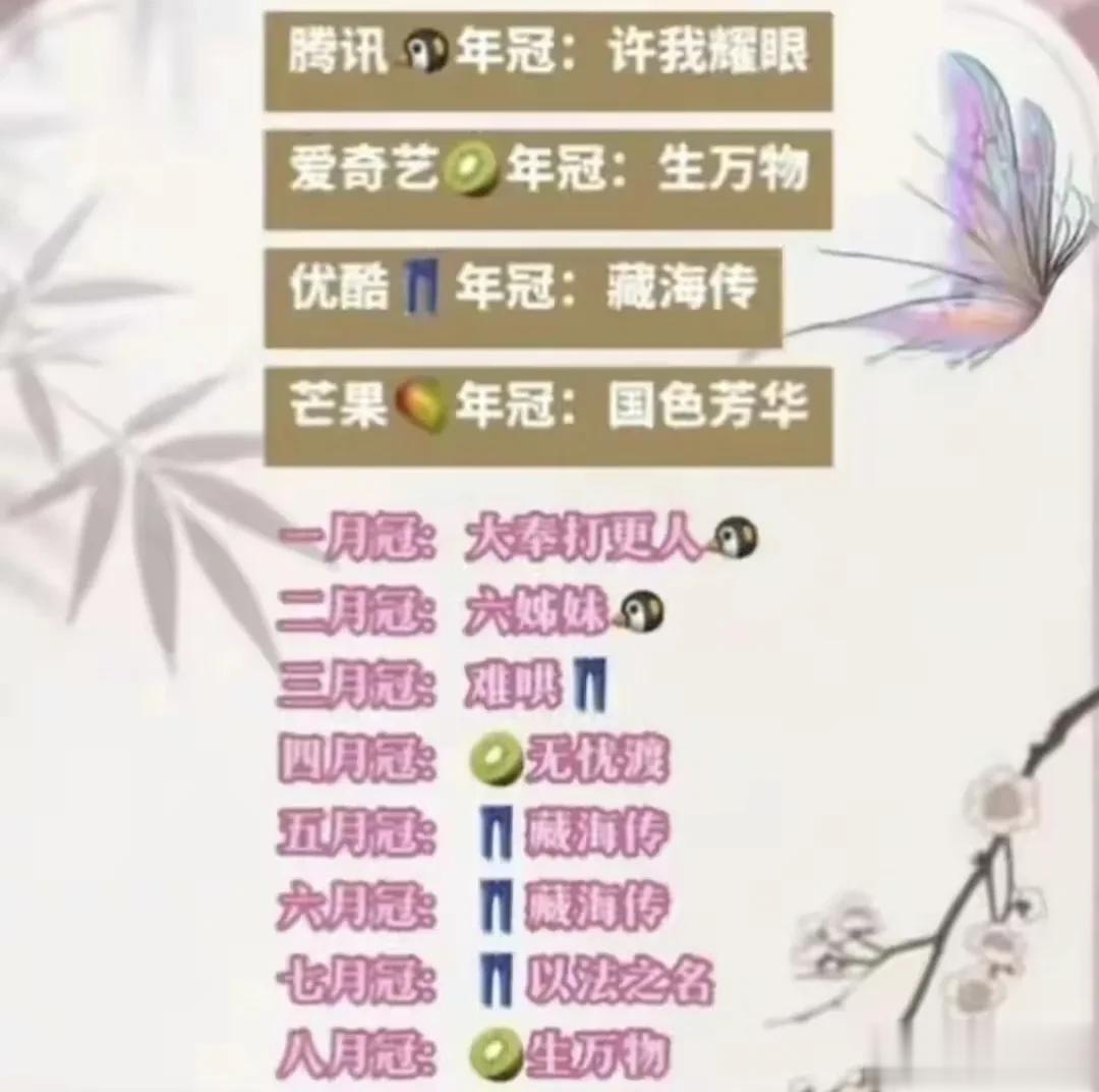根据这份扛剧榜单显示:50花top赵雅芝、55花top刘雪华、60花top宋丹丹、65花top蒋雯丽、70花top闫妮、75花top赵薇、80花top孙俪、85花top杨幂、90花top杨紫、95花top赵露思、00花top赵今麦。