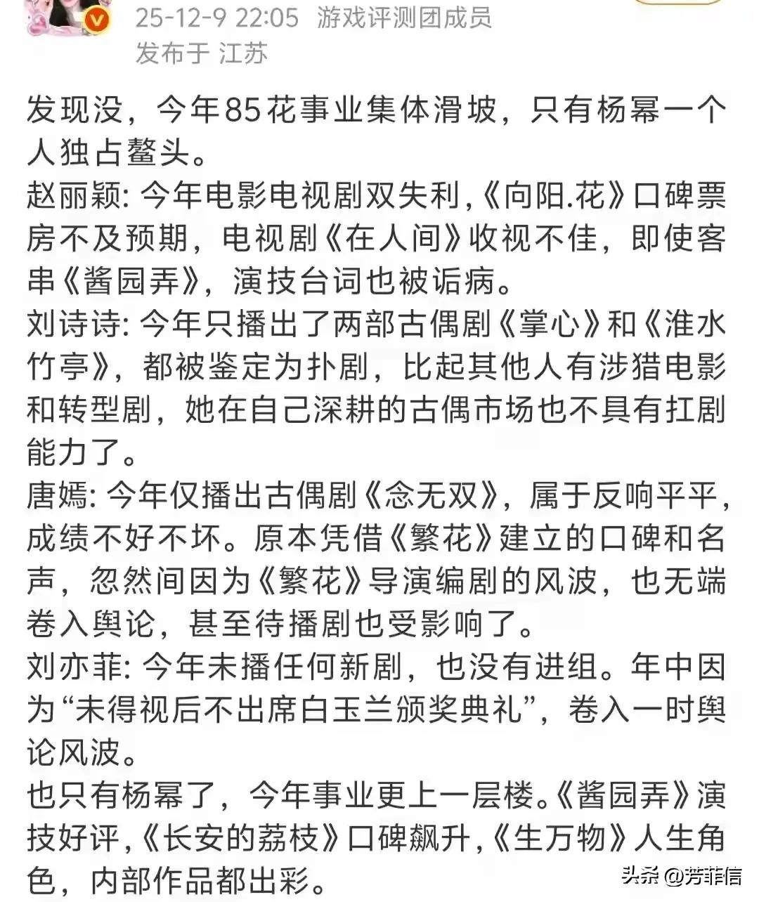 2025年,在一众85花集体走下坡路的时候,杨幂成为了唯一一位事业柳暗花明的存在。