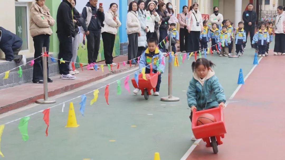 信阳市浉河区幼儿园宝贝们把“星球”放进“太空小车”,绕着“S形陨石带”运送,每次稳稳护送“星球”安全送到下一个小伙伴手里,都会露出灿烂的笑容。