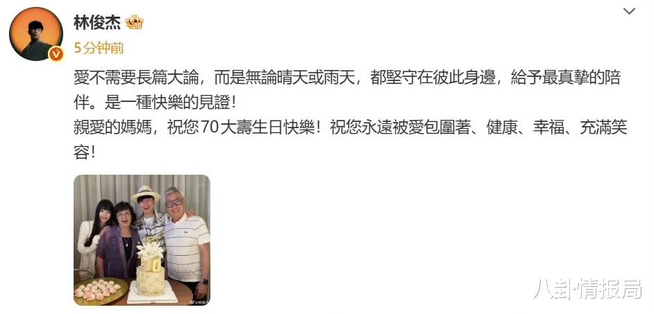 林俊杰借着给妈妈庆祝70大寿的机会,晒出了一张全家福。照片里,他和女友七七(Annalisa)陪着父母,那画面温馨得哟,简直能挤出蜜来。这哪是给妈妈过生日,分明是借机给咱们这些吃瓜群众发“糖”呢!