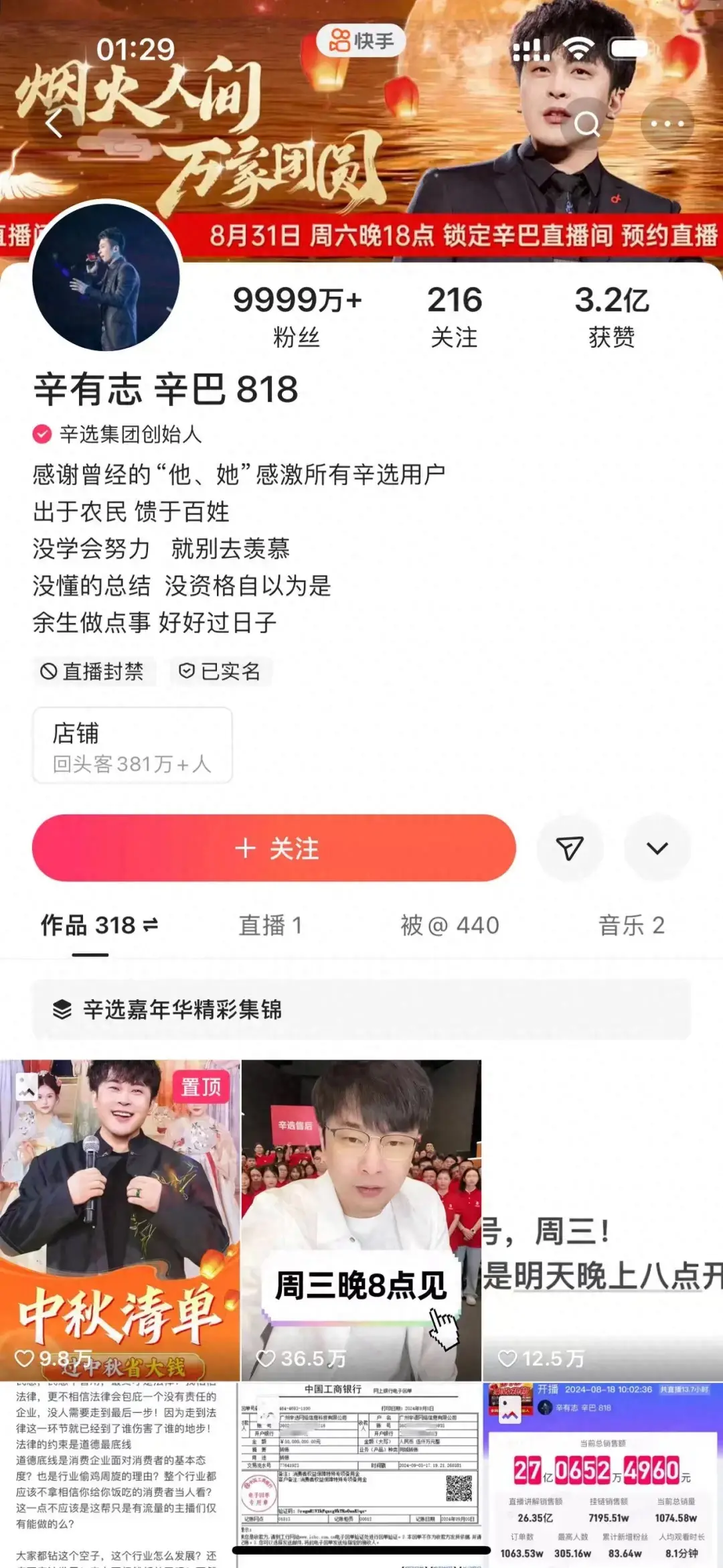 9月5日,辛有志(辛巴)在快手账号晒出一亿元转账记录。