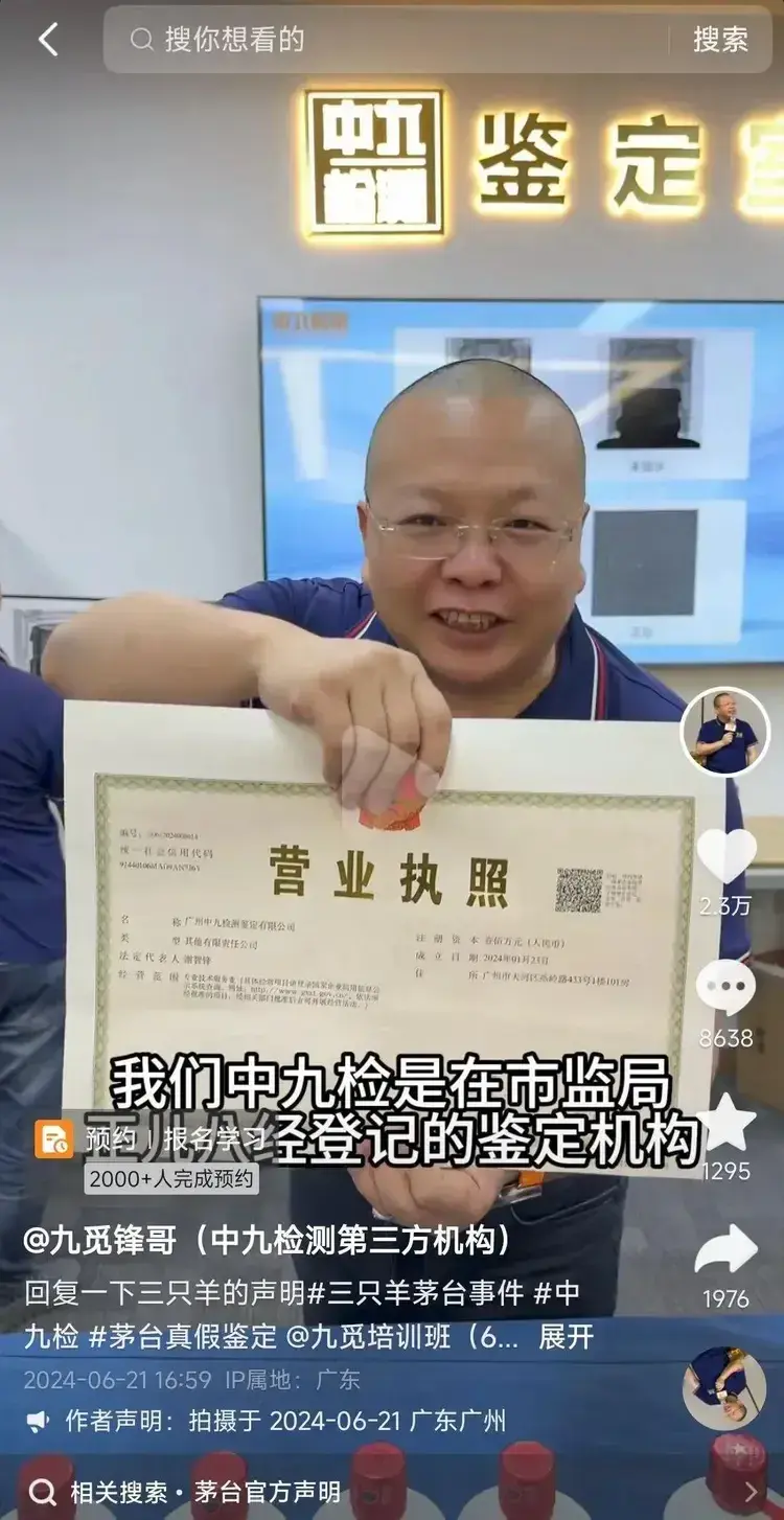 此后,广州中九检测鉴定有限公司负责人谢先生(九觅锋哥)也发布视频称,凡是在三只羊直播间购买了生肖茅台酒的用户,均可在九觅免费鉴定筛查。