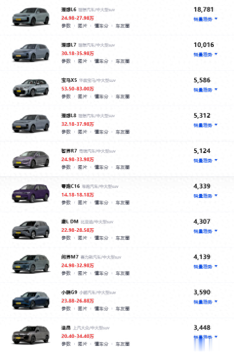 销量最高的10台中大型SUV,下面跟大家来看一下,最低的也不过是15万级别,对于理想来说真的是躺赢!十款车就有三款是理想。