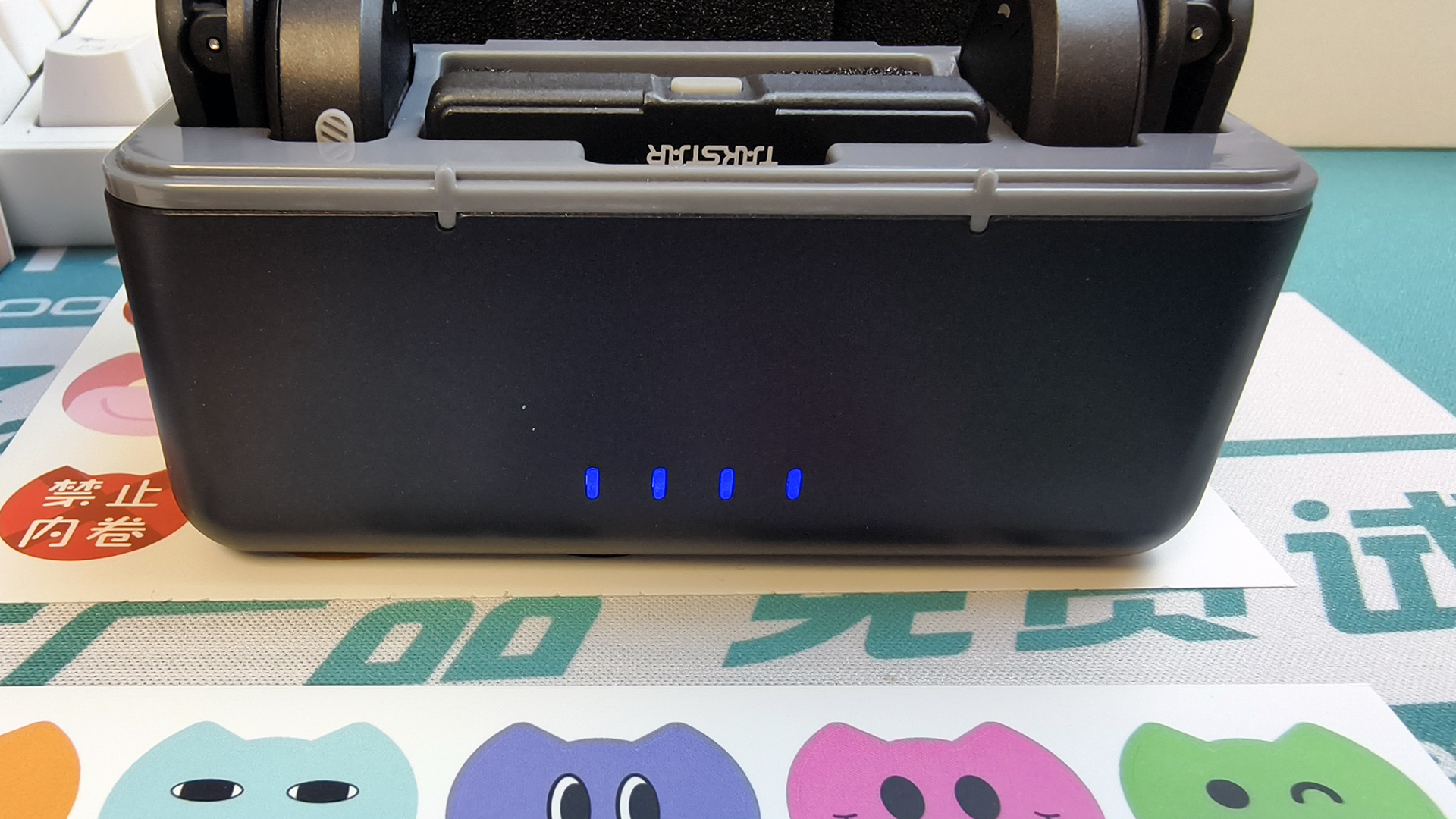 接收端的设计就更巧妙了,中间三个指示灯为增益状态,默认是开到最大的,我的录音习惯是调整以第二档,个人感觉就已经完全够用了,调整的按键设计在接收端的底部,操作起来也很方便。同时左右两侧还有发射端的连接指示灯,可以直观的查看两个发射端的工作状态。同时最神奇的是侧面还有一个TPYC接口,可以一边录制一边给设备充电,真的是太人性化了。
