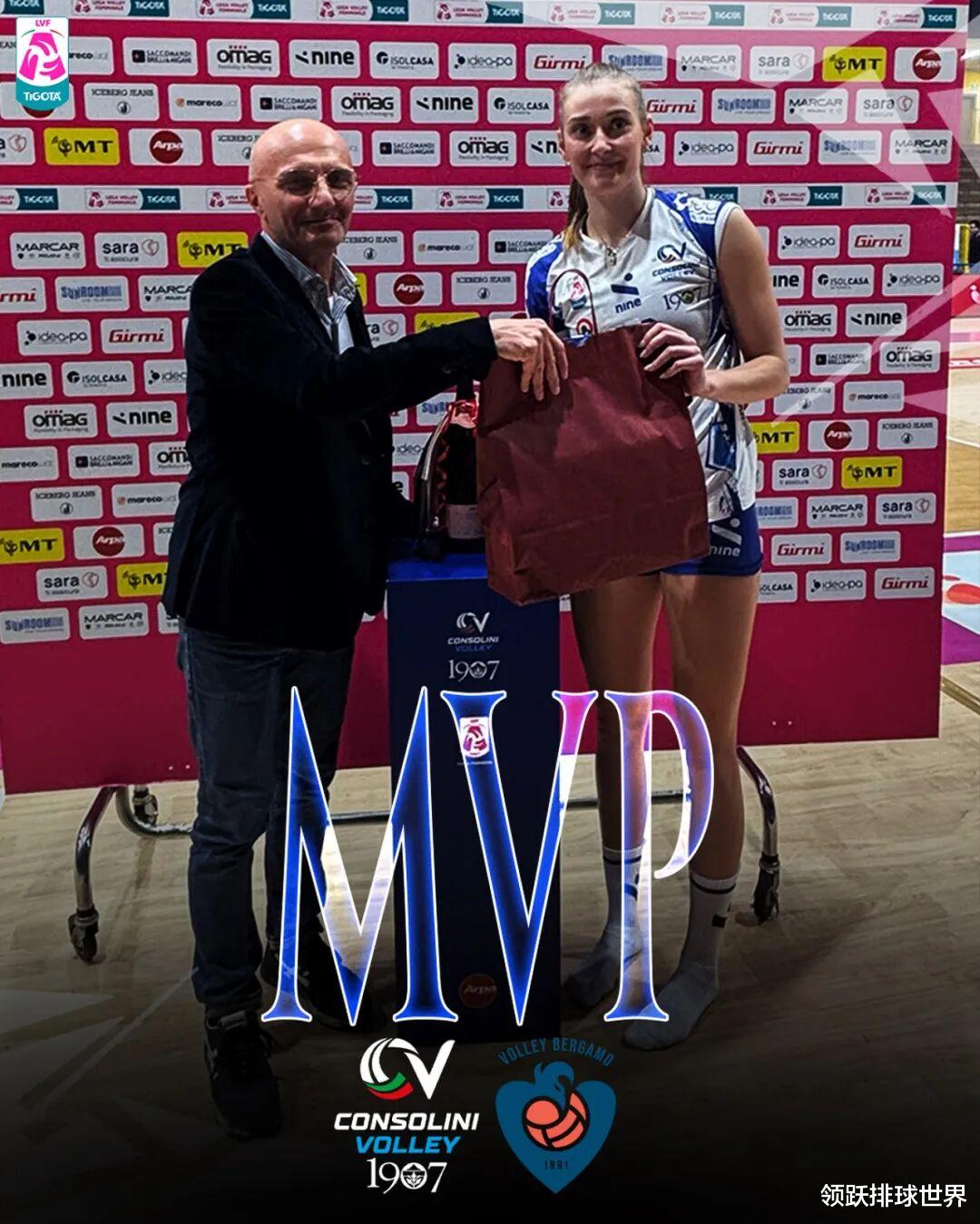 队友科丘里娜拿下20分(20扣14中5拦1发),老将奥托拉尼贡献15分(35扣14中1拦),而指挥全场进攻的二传斯特劳贝凭借精准调度和关键分处理能力荣膺本场MVP。贝加莫女排则1人上双,基普14分(40扣12中2发)。