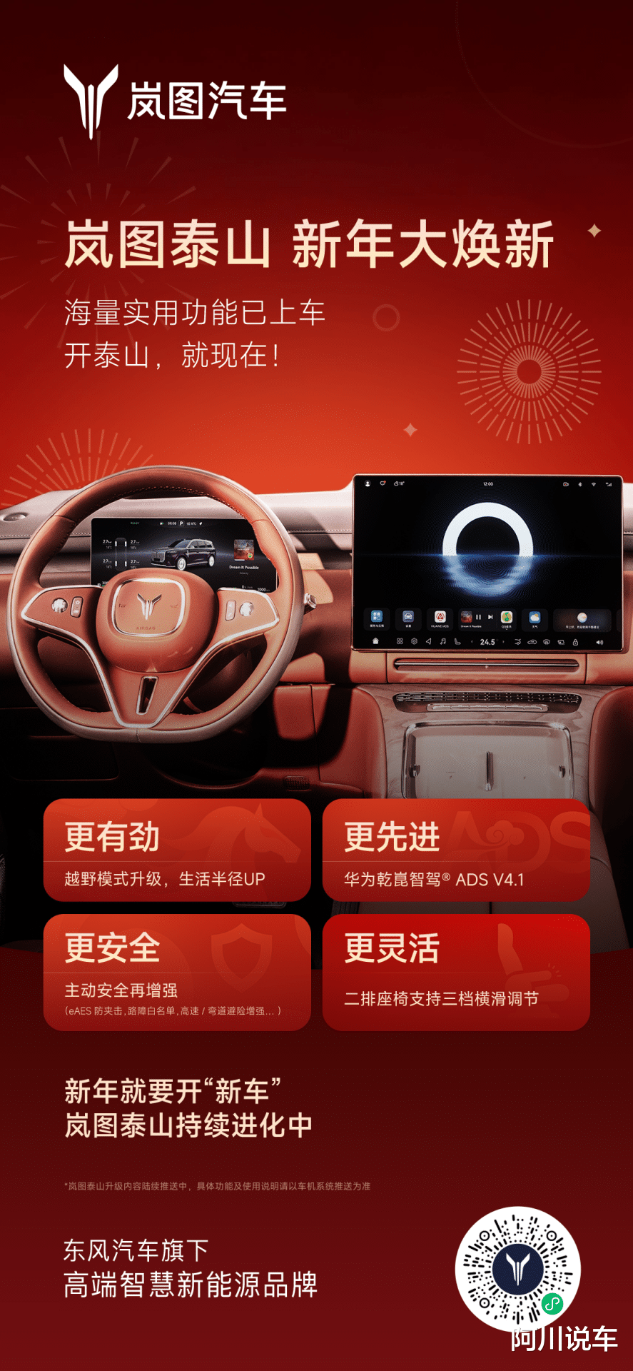 以乾崑之智,成泰山之稳。岚图泰山此次OTA,既是产品力的全面进阶,更是岚图“以用户为中心”与技术创新的集中体现。华为顶级智驾+独有的越野优势+贴合需求的座舱优化,重新定义高端商务SUV的全能边界。未来,岚图汽车将继续秉持“共赴美好生活”的品牌使命,以技术创新驱动产品升级,为高端用户打造更有温度、更全能的智能移动空间,推动高端商务SUV市场进入全场景发展的新阶段。