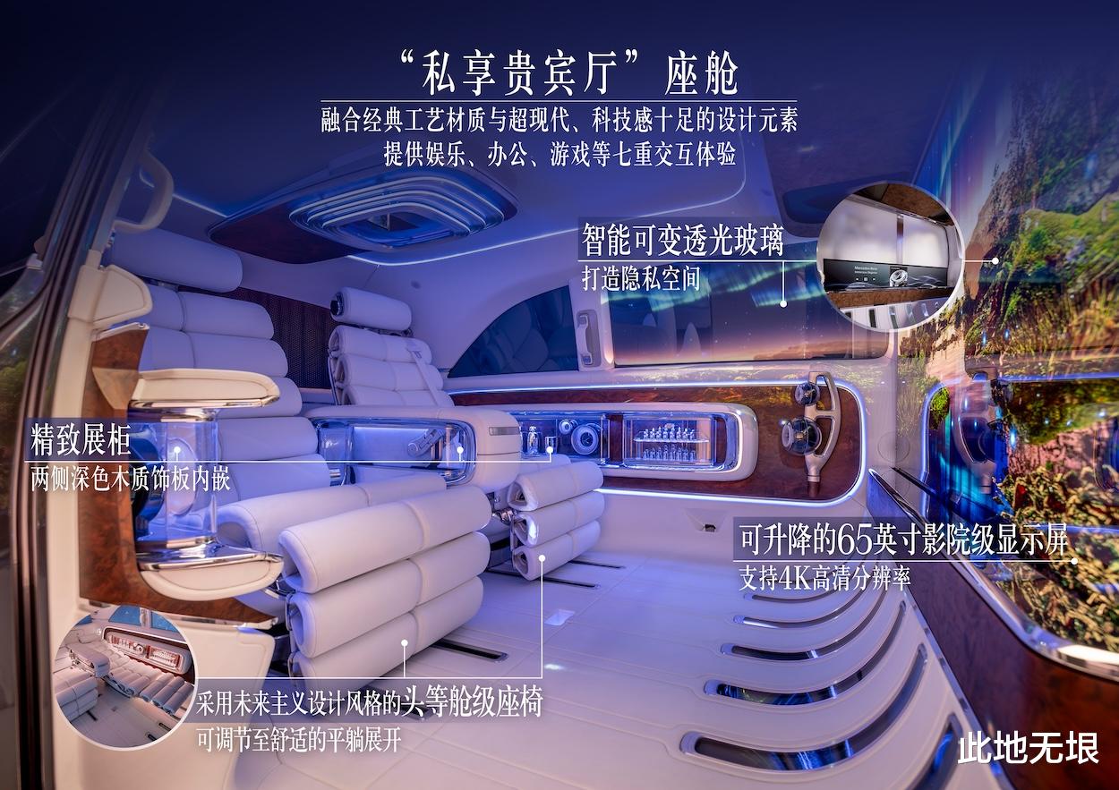 车内空间方面,智能可变透光玻璃分隔乘客舱与驾驶舱,可无级调节透明度。水晶白色Nappa皮饰、白色丝光绸缎与大面积开孔胡桃木饰件格调优雅。头等舱级座椅有多种调节模式,甚至可调节至舒适的平躺展开。两侧木质饰板与双独立座椅之间的中控台内嵌精致展柜,集成可折叠桌板,桌板展开后为国际象棋棋盘。